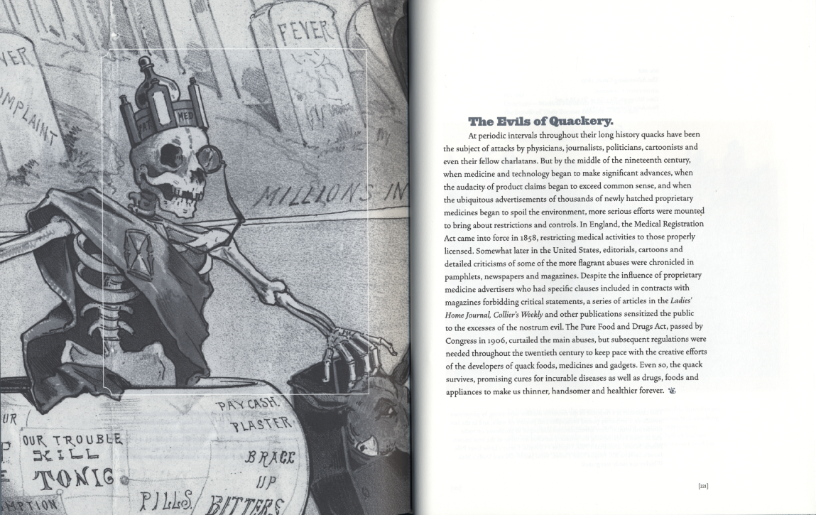And though recent strides in medicine mean that most people avoid quacks, and efforts have been made to rid society of patent-medicine makers, the quack survives to the present day, promising to make us all thinner, better-looking, healthier, or more sexually potent. This catalogue--and the 2002 New York City Grolier Club exhibition it originally accompanied–are fascinating reminders of how long such promises have been with us, and in how many unique and scintillating ways they've been made.